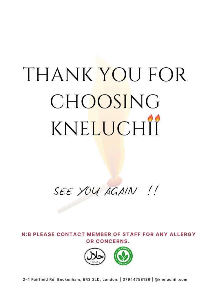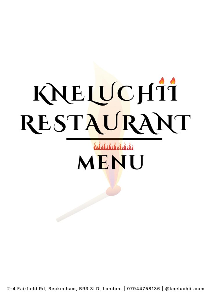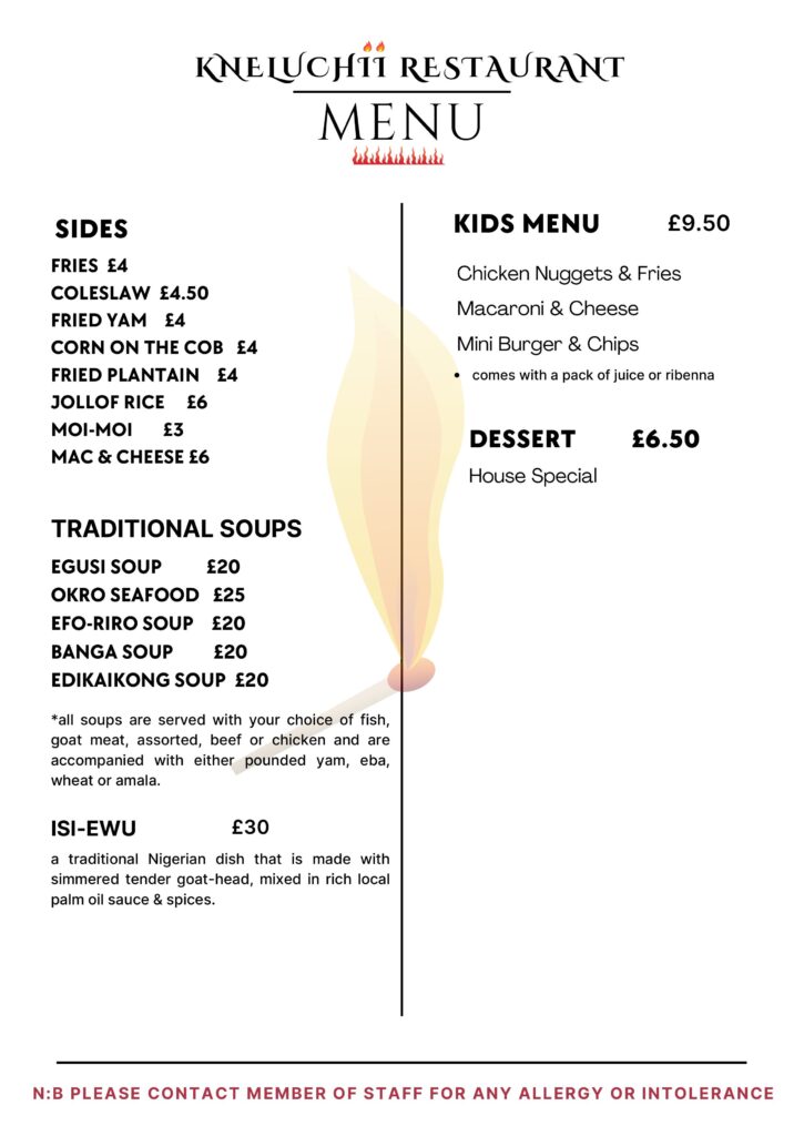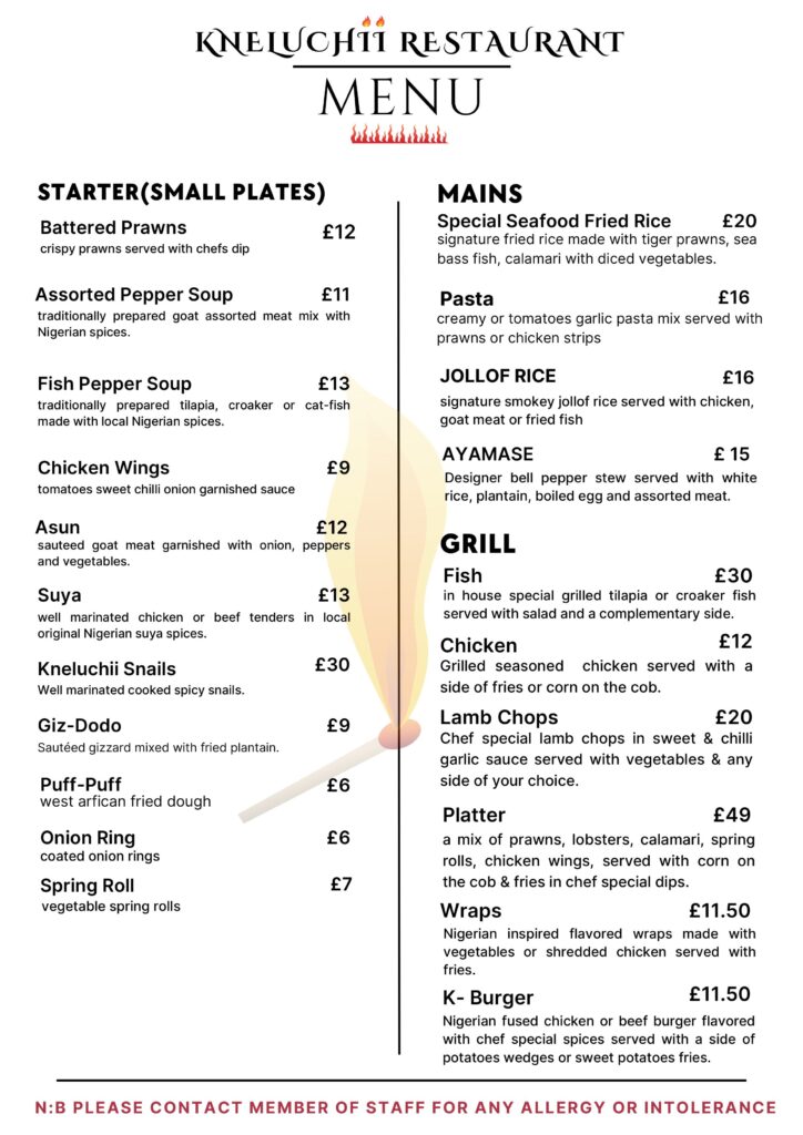 Our Menu STARTER BATTERED PRAWNS £12 king Prawns coated in bean cake mix SUYA ONION RINGS £6 coated onions in battered suya mix GIZ-DODO £8 Sauteed gizzard mixed with diced fried plantain. CHICKEN WINGS £9 flavoured wings GOAT MEAT/ASSORTED PEPPER SOUP £10 traditionally prepared goat meat and assorted meat made with local Nigerian spices FISH PEPPER SOUP £12 traditionally prepared tilapia or cat fish made with local Nigerian spices ASUN £12 sauteed goat meat garnished with onion, peppers and vegetables SUYA £12 well marinated chicken or beef tenders in local original Nigerian suya spices MAINS SPECIAL SEAFOOD FRIED RICE £18 signature fried rice with tiger prawns, salmon, calamari, and vegetables PASTA £13.50 tomatoes or creamy sauce pasta made with prawns or chicken EGUSI SOUP £18 OKRO SEAFOOD £20 EFO-RIRO SOUP £18 EDIKAINKONG SOUP £18 AFANG SOUP £18 BANGA SOUP £20 NOTE: *All soups are served with your choice of protein and are accompanied with either pounded yam, eba or wheat NOODLES £13 Nigerian inspired fried vegetable noodles served with omelettes and plantain JOLLOF RICE £14 signature smokey jollof rice served with chicken, goat meat or fried fish GRILL K PLATTER £39.50 a mix of lobsters, king prawns, calamari, lamb chops, chicken wings, served with corn on the cob and fries in chef special dips. FISH £18 in house special grilled tilapia or catfish served with vegetables and a complementary side CHICKEN £11 grilled seasoned half chicken served with a side of your choice LAMB CHOPS £16 chef special lamb chops served with steamed carrots SHAWARMA £12 Nigerian inspired shawarma made with vegetables and hot dog served with fries or wedges SIDES WEDGES OR FRIES £4 GIZ-DODO £8 FRIED YAM OR PLANTAIN £4 CORN ON THE COB £5 FRIED PLANTAIN £5 COLESLAW £4 Reservation Contact us for your orders and reservations. Order now Telephone Reservations +44 7944 758136 Landline Phone 02030933374 We serve 100% halal food!